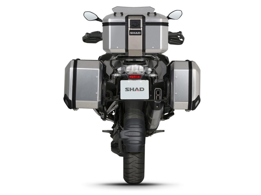 The complete set of cases SHAD TERRA includes aluminum top case TR37 with a capacity of 37L, aluminium left case TR47 with a capacity of 47L and a smaller right case TR36 with a capacity of 36L due to the location of the exhaust. The right suitcase will not protrude. The set contains everything you need to mount both suitcases to the motorcycle.
